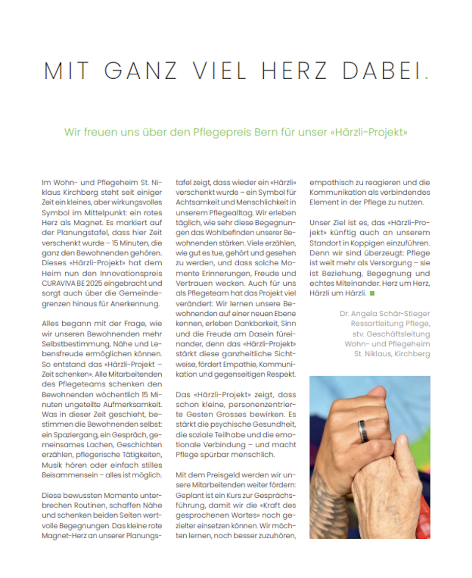 Der Pflegepreis Bern bestärkt uns darin, diesen Weg konsequent weiterzugehen: